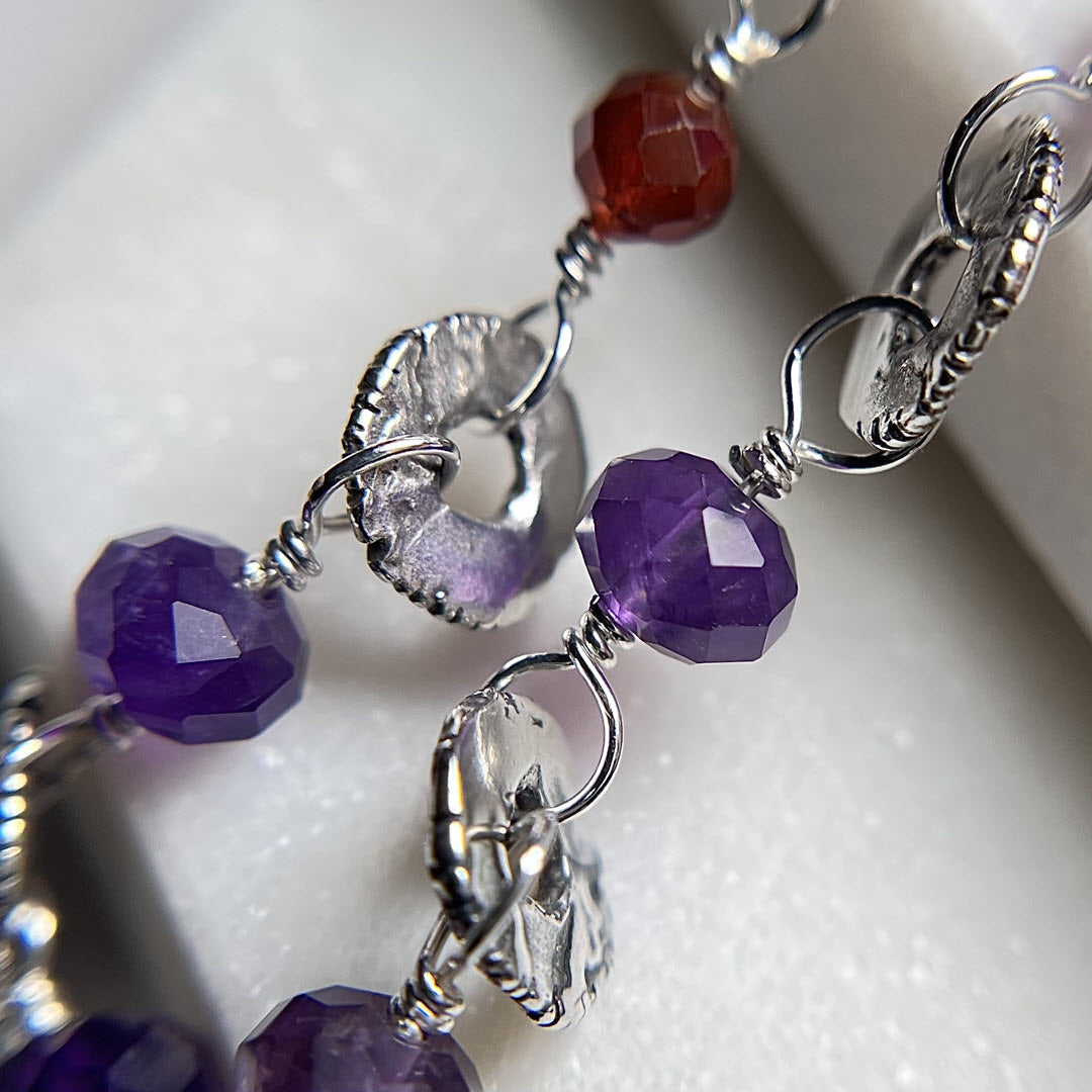Hessonite and Amethyst Long Dangle Earrings, Sterling