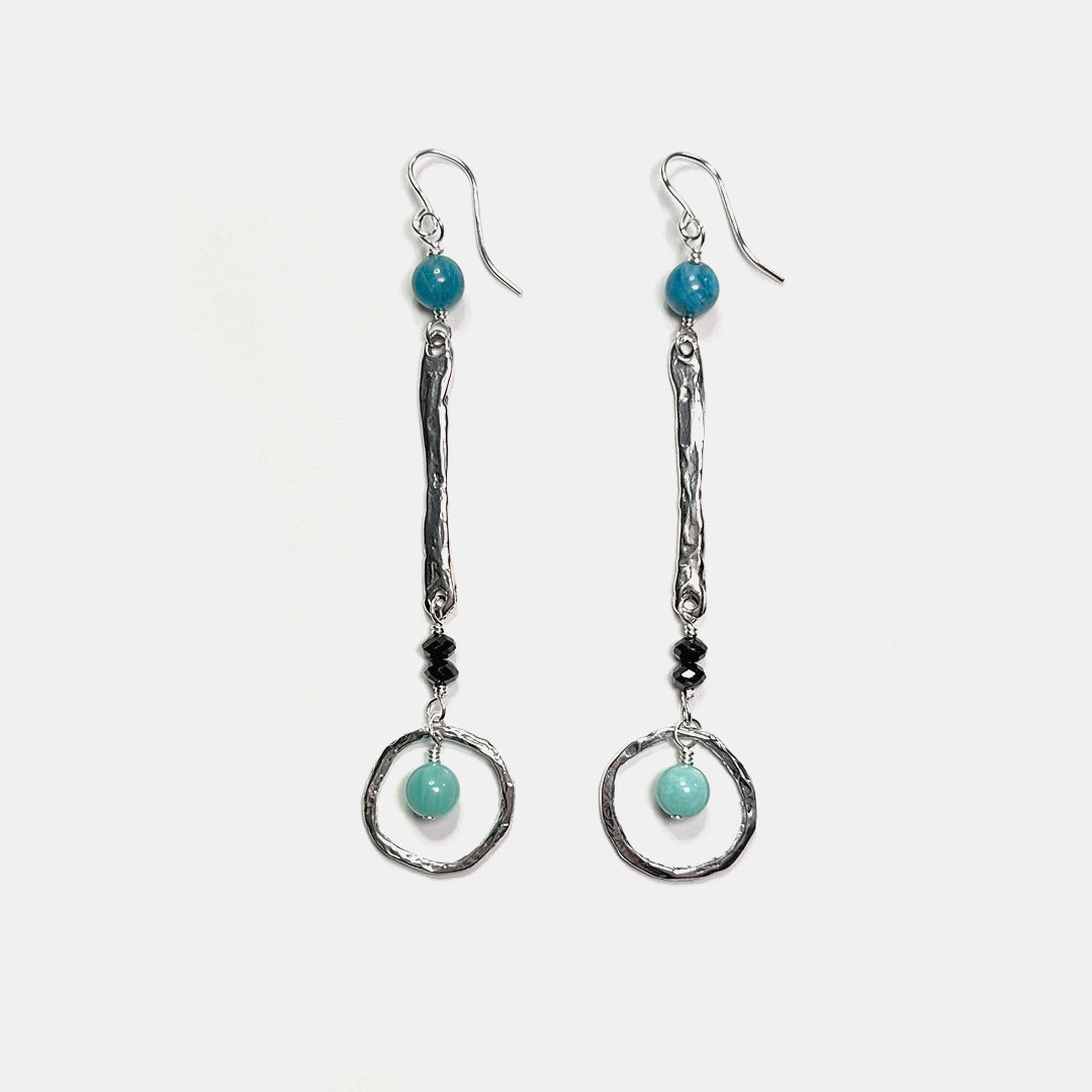 - Materials: amazonite, neon apatite, black spinel, sterling silver